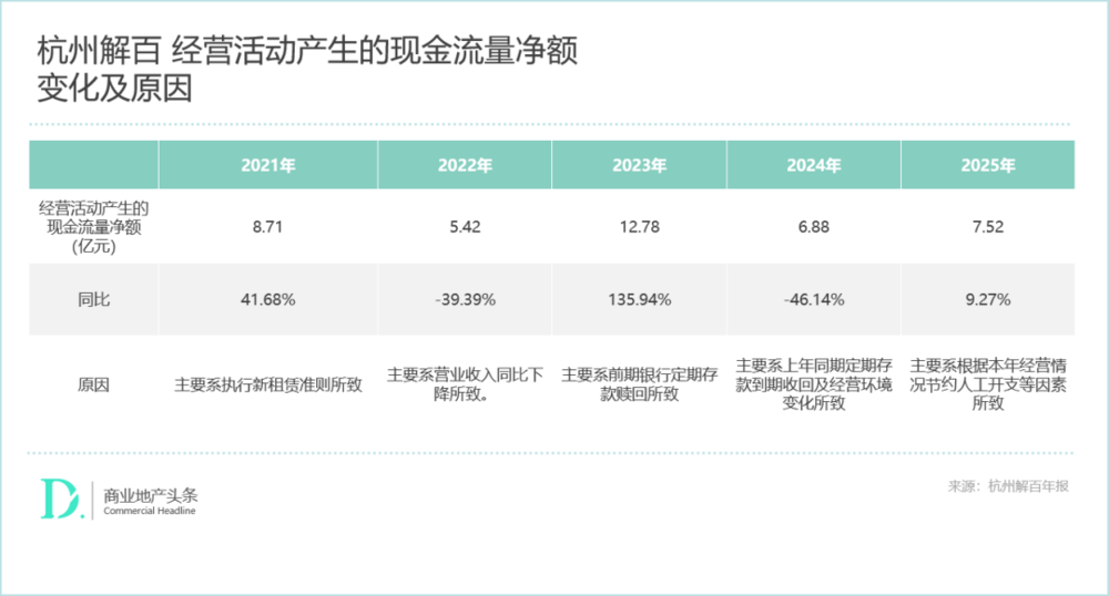 但值一提的是,在一系列积极调整下,解百的营收降幅缩窄了,且经营活动产生的现金流量净额更是重回增长。数据显示,杭州解百2025年的经营性现金流净额却同比增长9.27%至7.52亿元。公司在盈利承压的情况下,加强成本端控制改善现金流的,包括节省人工开支等措施。