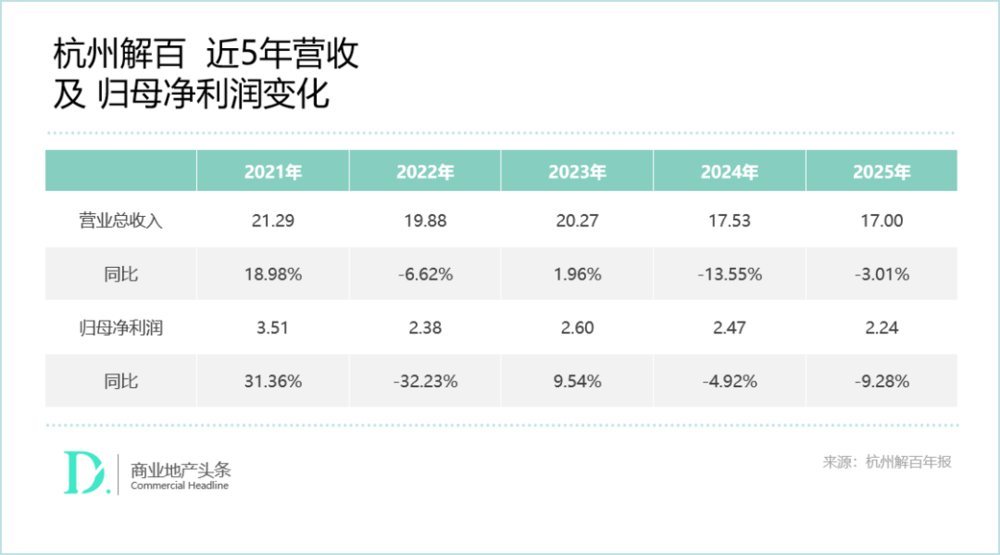 财报显示,2025年杭州解百实现营业收入17亿元,同比下降3.01%;归母净利润2.24亿元,同比下滑9.28%,核心盈利指标全面承压,而作为营收主力的杭州大厦,其表现直接关联集团业绩走向。