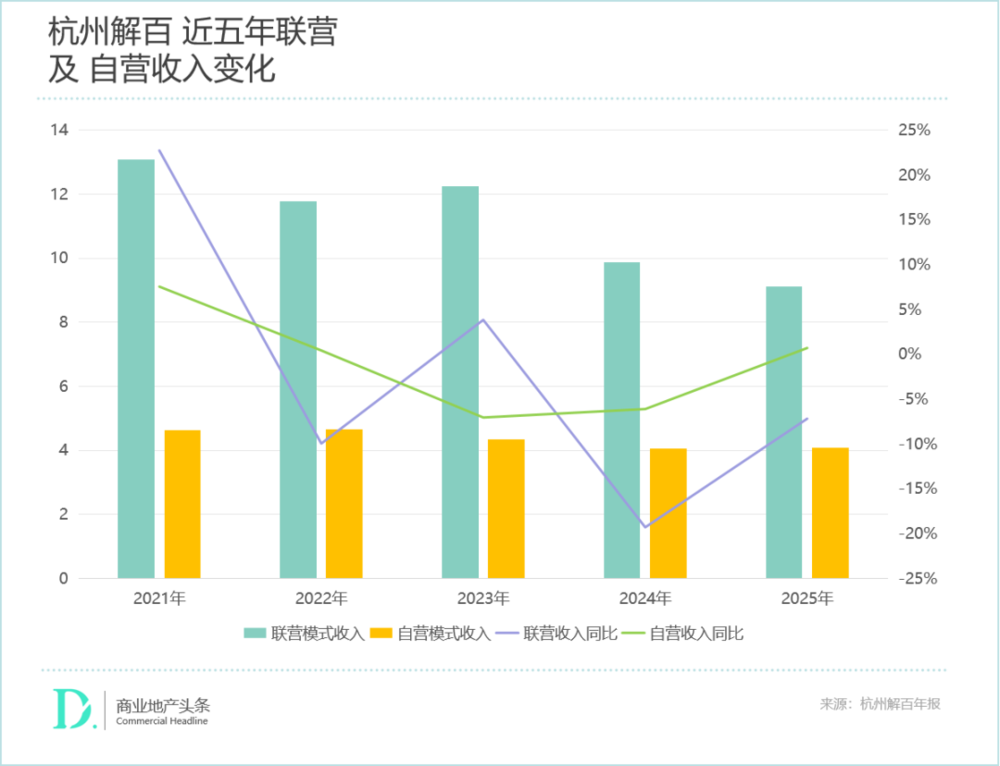 2025年,杭州解百零售业务收入13.27亿元,同比下降5.20%。其中,联营模式收入9.17亿元,同比下滑7.17%,拉低了公司整体盈利水平;自营模式收入4.10亿元,同比2024年略有提升。
