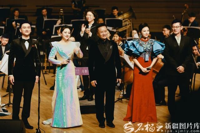 “永远的小白杨”阎维文师生民族声乐音乐会演出现场,阎维文(左三)和他的学生们。新疆爱乐乐团供图