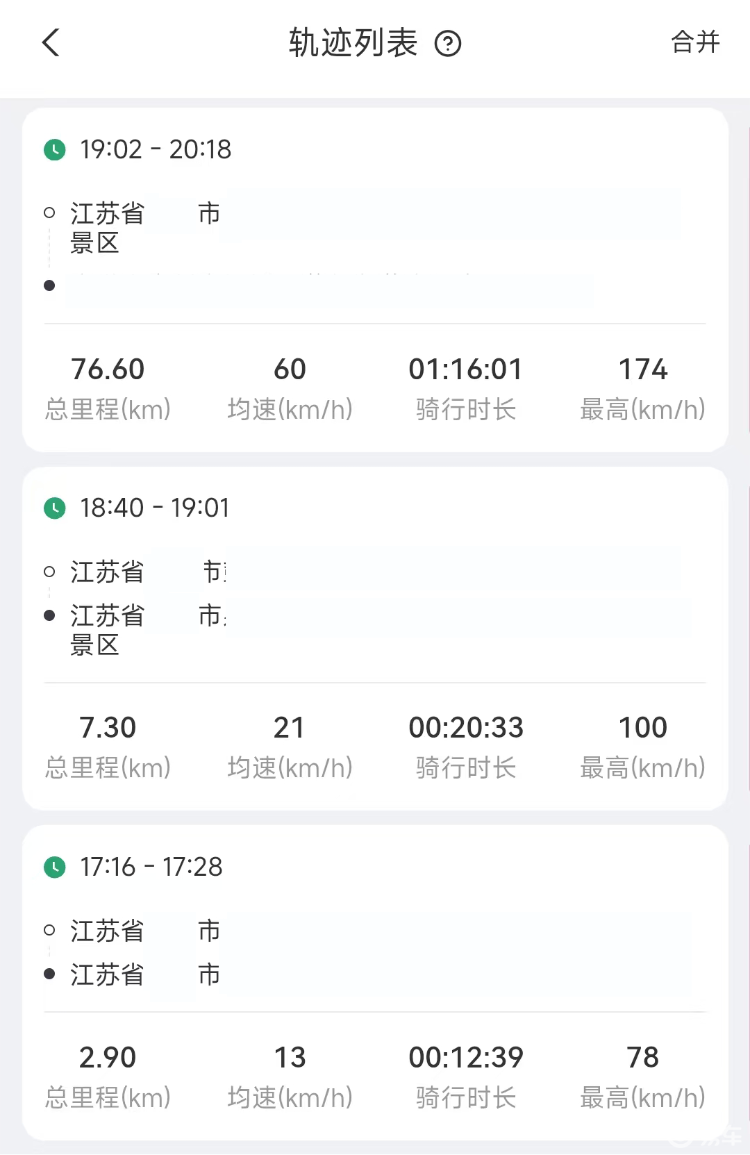 在轨迹列表中可以看到最高时速达到174km/h,虽然平均时速没有超速,但据描述该路段并非高速公路;而且江苏高速是不允许摩托车驶入的,也就是说其驾驶摩托车在国省道公路上最高开到该时速,而这样的公路里的一部分路段限速只是60km/h,行经村镇或学校路段的话,最低限速只是20km/h,所以60km/h的平均时速已经是一个非常夸张的数值,而这名网友称自己后来也感觉到后怕。