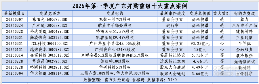南方财经记者梳理公开数据发现,2026年一季度,广东共有76家上市公司披露并购重组最新进展,同比增加超过110%,占全国总数量(396单)比例为19%,其中有4单交易是重大资产重组,已经披露的交易金额超过500亿元。